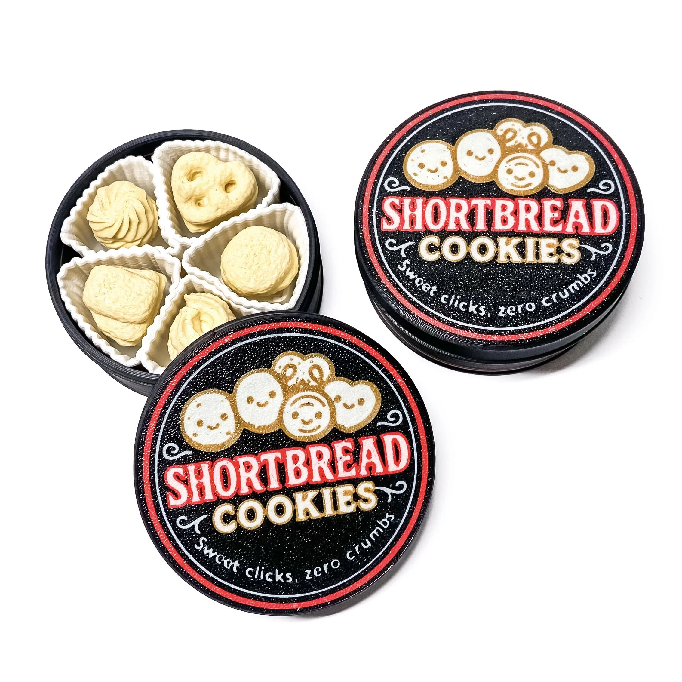 A palm-sized cookie tin packed with five shortbread cookie clickers for sensory satisfaction on the go. Sweet clicks, zero crumbs.